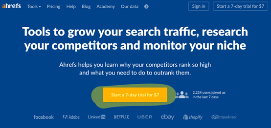 例如,Ahrefs主页上那个号召按钮,上面写着“Start a 7‑day trial for $7”,这是一个明确的行动号令。通过点击这个按钮,引导访问者对工具进行购买和使用。