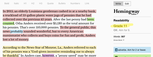 上述的这个页面的另一个问题,是它使用复杂的语言环境。事实上,Hemingway告诉我们,这页内容的阅读者需要有11年级(高中)以上的阅读水平。