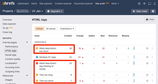 为此,我们需要前往Ahrefs的Site Audit获取HTML标签检测报告。