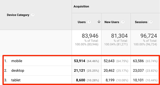在这里,你可以把来自移动与PC端的访客用百分比的形式做个对比。你也可以使用谷歌的移动友好测试工具,检查你网站的移动端的表现情况。