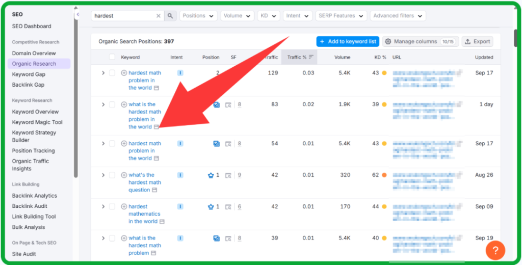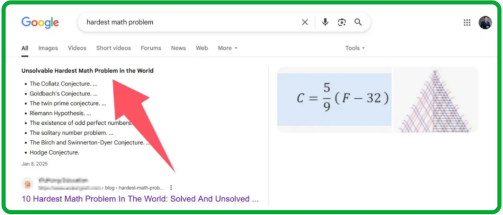 比如之前,我担任北京教育公司网站SEO总监,关于“the hardest math problems”关键词,月均搜索量在5K左右。文章中含有List+Table结构,被Google选中作为精选摘要。