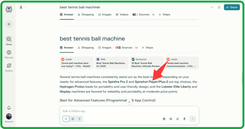 幸运的是,由于高权重外链平台加持。当用户使用AI寻找产品推荐时,Spinshot Sports的名字,赫然在列。