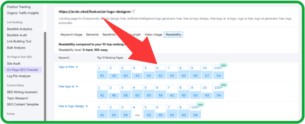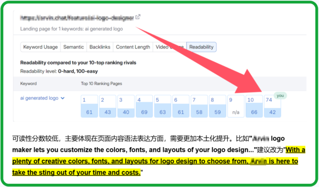 Semrush针对页面可读性,给出谷歌前10名竞对网站的平均得分。因此,当我仔细找出对应句子或者段落时(可读性低),开始重写。