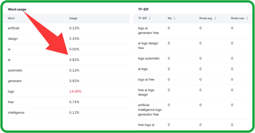 - 页面核心关键词使用频率和占比;