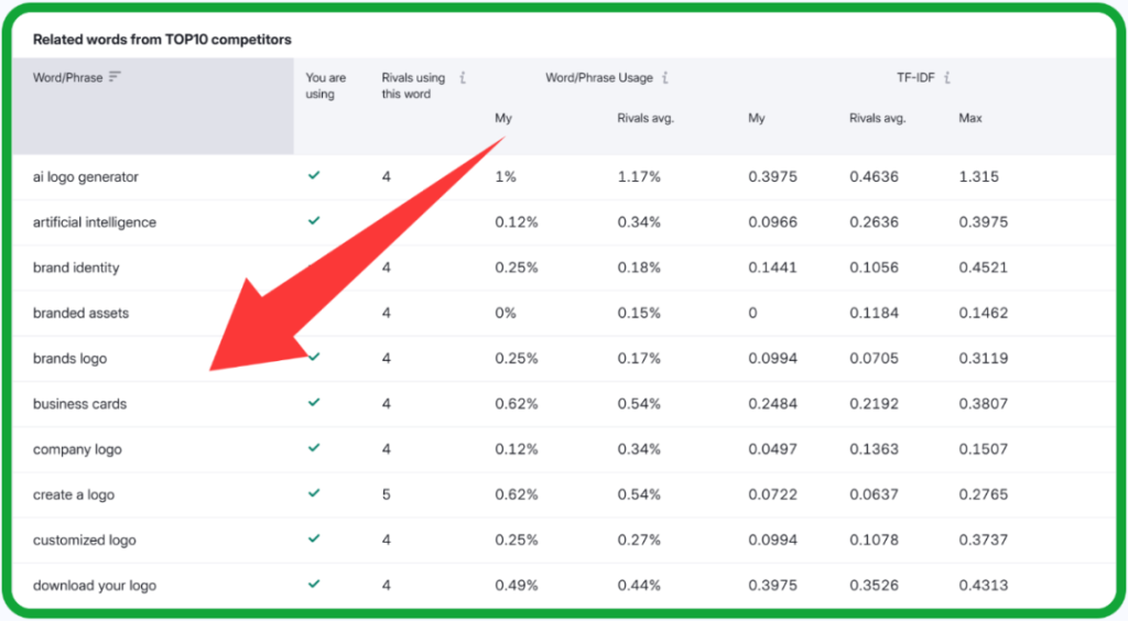 在优化On-page过程中,我依然会根据全球Top10竞对页面内容数据,扩展相关关键词的内容丰富度。主要比对: